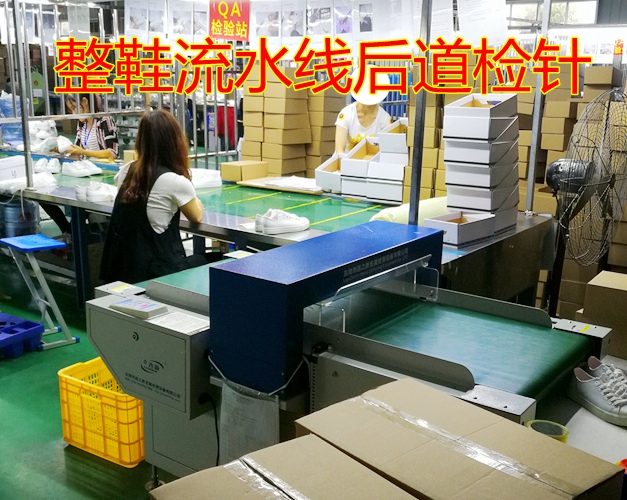 鞋子经过几道检针后,装盒子了再检测一边方可装箱: